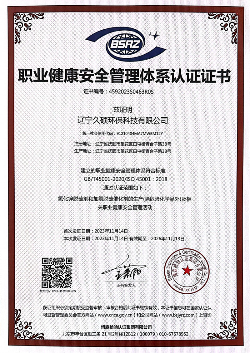 职业健康安全体系认证证书