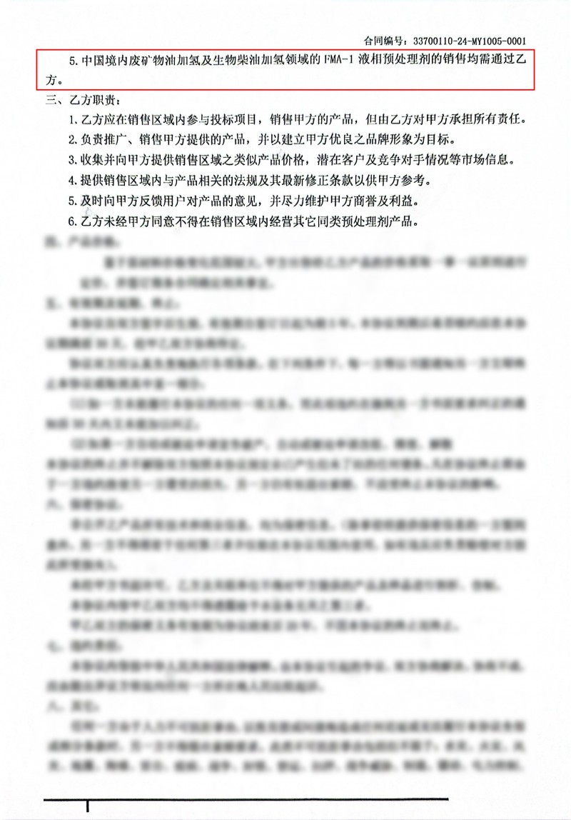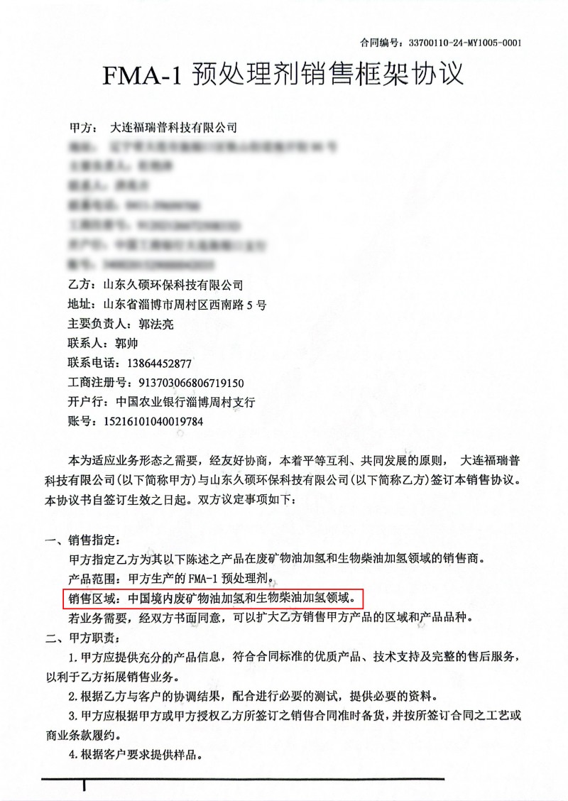 FMA-1已在新疆某企业5万吨/年全馏分油废矿物油加氢再生装置工业应用,该套装置采用均相预处理工艺,以FMA-1为预处理剂,取得良好效果,预加氢液收达99%,较对比剂提升8%,废矿物油再生经济性大幅提升,受企业高度好评。